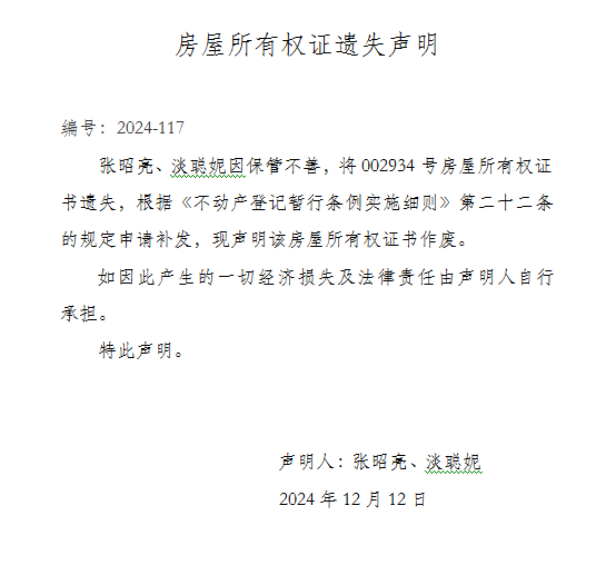 房屋所有權(quán)證遺失聲明 編號:2024-117