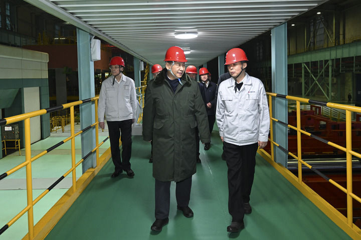 1月22日至24日,中共中央總書記、國家主席、中央軍委主席習近平冒著嚴寒來到遼寧,看望慰問基層干部群眾。這是23日下午,習近平在本溪市考察本鋼板材冷軋總廠第三冷軋廠車間。新華社記者 翟健嵐 攝