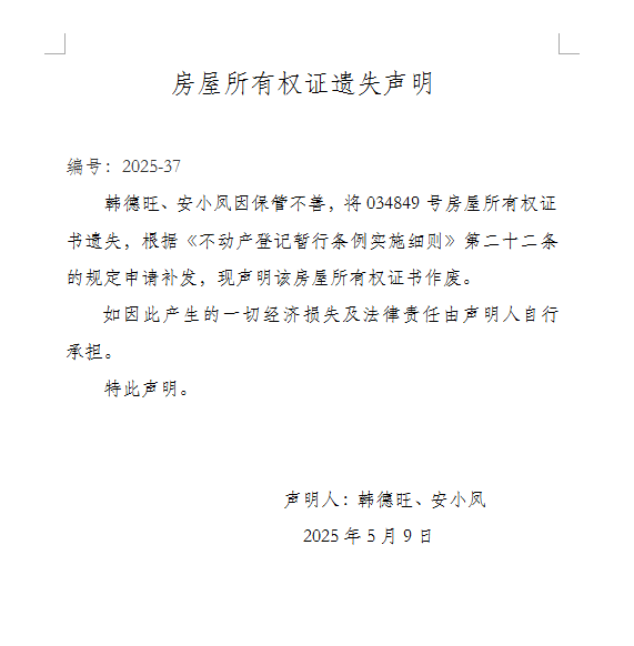 房屋所有權(quán)證遺失聲明 編號:2025-37