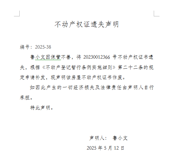 不動產權證遺失聲明 編號:2025-38