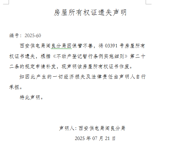 房屋所有權(quán)證遺失聲明 編號(hào):2025-60