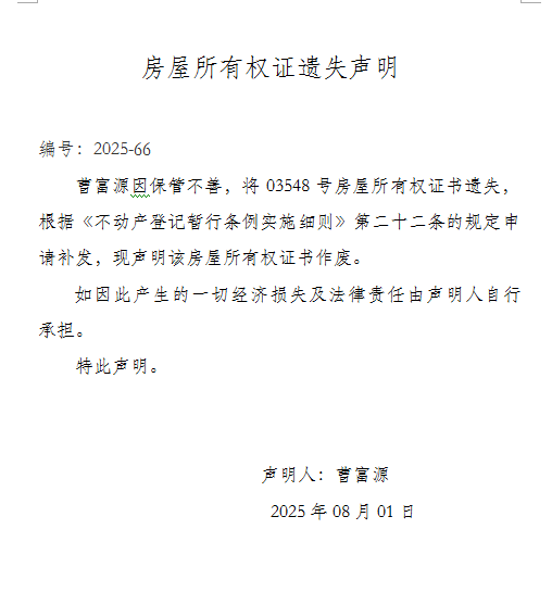 房屋所有權(quán)證遺失聲明 編號:2025-66