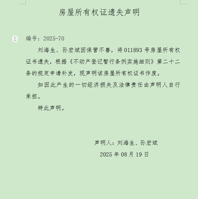 房屋所有權證遺失聲明 編號:2025-70