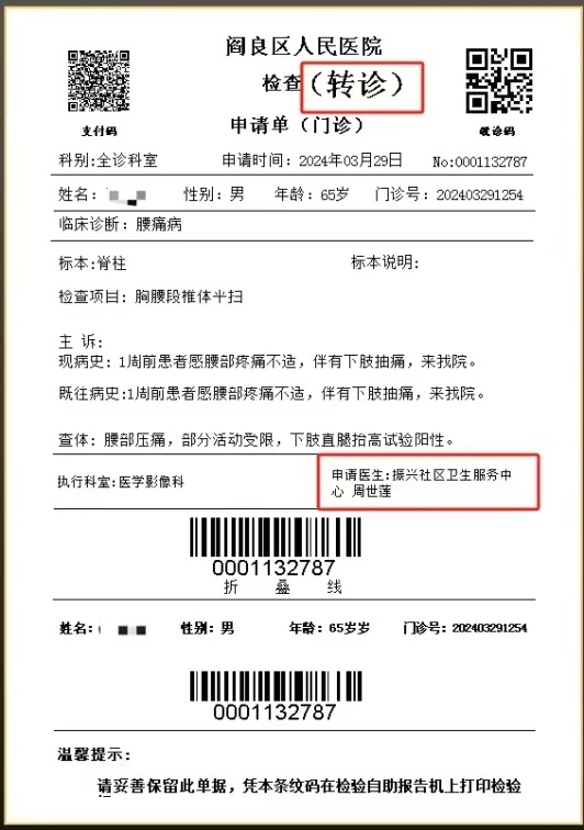 3月,遠程開單功能上線。群眾在衛生院(社區衛生服務中心)就診時,醫生可開具區人民醫院的檢查檢驗申請單,群眾持申請單繳費后到區人民醫院執行科室完成檢查,彌補跨院檢查空白。檢查完成后手機上查看報告,實現業務閉環。