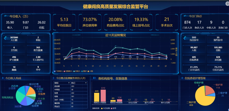 整合區域醫療機構信息系統數據資源,搭建健康閻良高質量發展綜合監管平臺,全面呈現醫院醫療資源、日常門診、住院患者、醫療服務、藥品管理、醫院運維等領域的關鍵指標,實現門診態勢、病床病患監測、藥品管理可視化,便于管理部門實時掌握醫療機構運行情況,為科學動態決策提供支持。