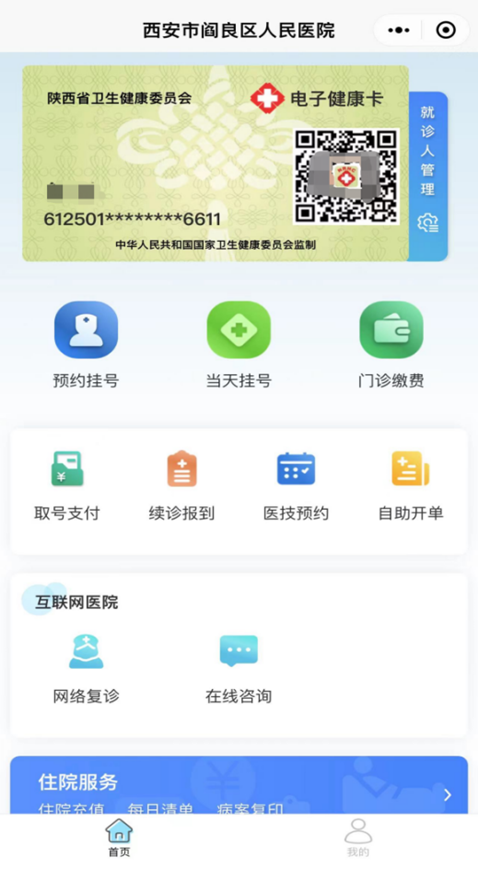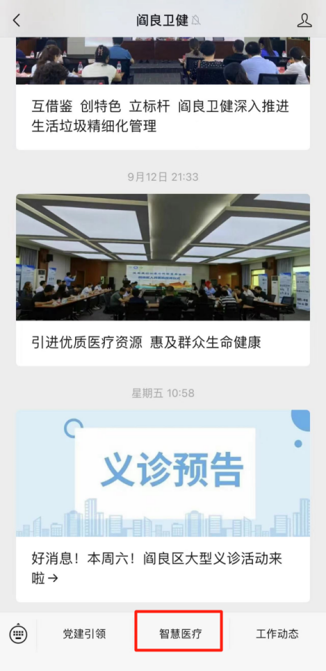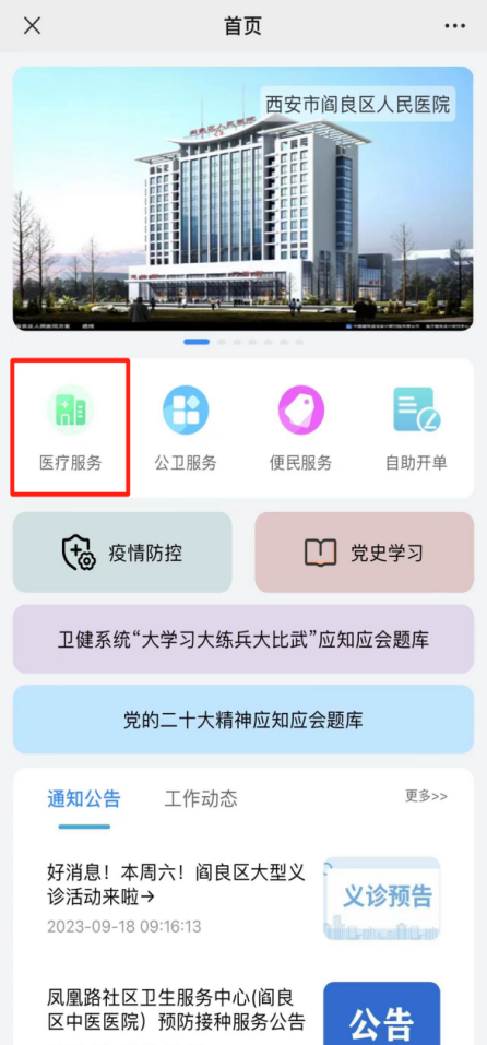 第一步:關(guān)注“健康閻良”微信公眾號,來到“智慧醫(yī)療”首頁,打開“醫(yī)療服務(wù)”。