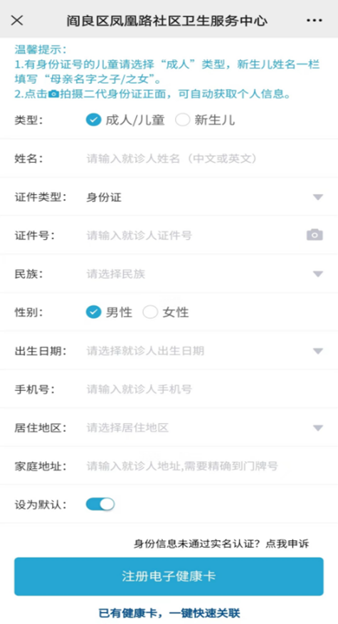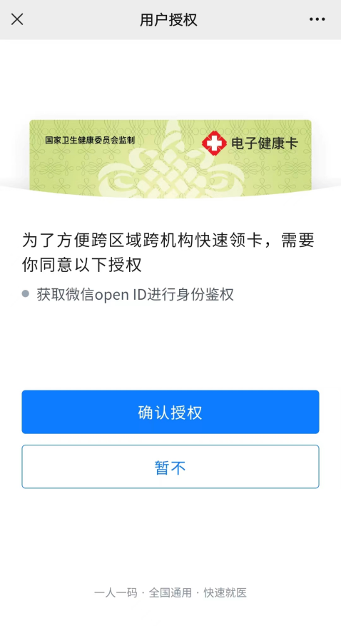 第三步:在個人界面點擊注冊,確認(rèn)授權(quán),輸入證件號、手機號、家庭地址等信息,即可獲取個人電子健康卡。