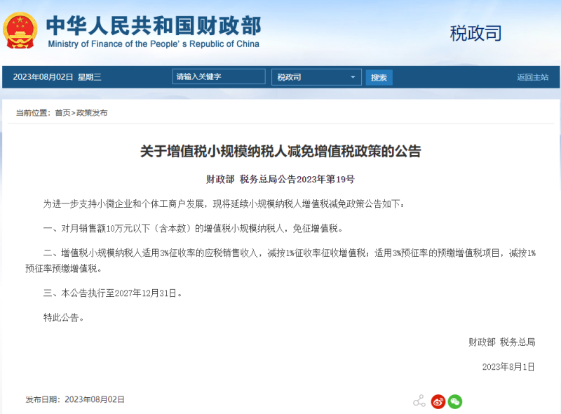 據財政部網站8月2日消息,財政部、稅務總局發布《關于增值稅小規模納稅人減免增值稅政策的公告》,為進一步支持小微企業和個體工商戶發展,現將延續小規模納稅人增值稅減免政策公告如下: