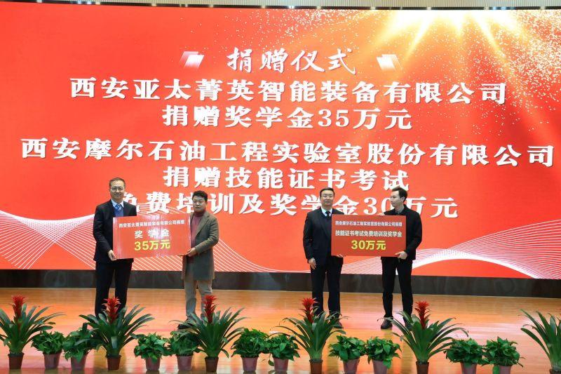 西安亞太菁英智能裝備有限公司給西航職院設立獎學金;西安摩爾石油工程實驗室股份有限公司捐贈技能證書考試免費培訓及獎學金