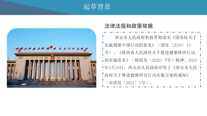 西安市人民政府積極貫徹落實《國務院關于實施健康中國行動的意見》(國發〔2019〕13號)、《陜西省人民政府關于推進健康陜西行動的實施意見》(陜政發〔2020〕7號)精神,2021年1月19日,西安市人民政府印發了《西安市人民政府關于推進健康西安行動實施方案的通知》(市政發〔2021〕1號)。