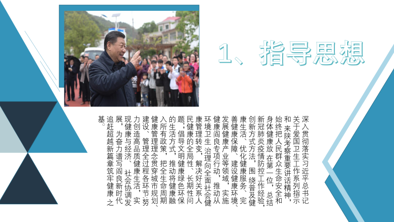 (一)指導思想。深入貫徹落實習近平總書記關于愛國衛生工作系列指示和 來陜考察重要講話精神,始終把人民群眾生命安全和身體健康放 在第一位,總結新冠肺炎疫情防控工作經驗,創新方式方法,圍 繞普及健康生活、優化健康服務、完善健康保障、建設健康環境、發展健康產業等領域,實施健康閻良專項行動,推動從環境衛生 治理向全面社會健康管理轉變,解決好關系人民健康的全局性、長期性問題;倡導文明健康綠色環保的生活方式,推動將健康融 入所有政策,把全生命周期健康管理理念貫穿城市規劃、建設、管理全過程各環節;努力創造高品質健康生活,實現健康與經濟、 社會協調發展,為奮力譜寫閻良新時代追趕超越新篇章筑牢健康 之基。