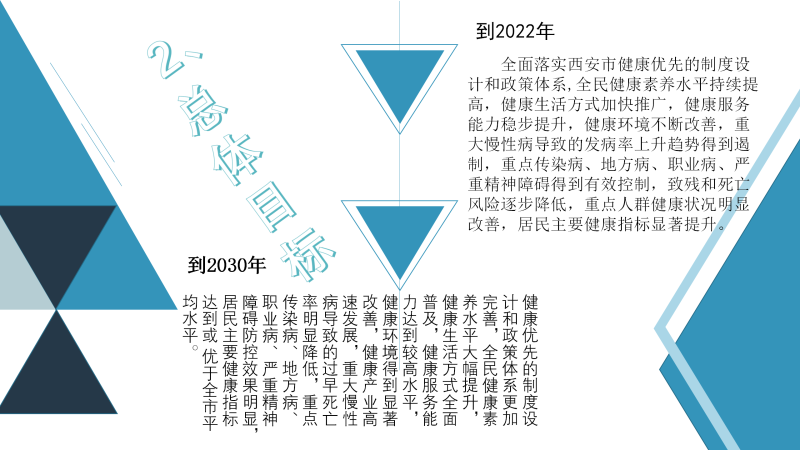 (二)總體目標。到2022年,初步建立西安區域健康優先的制度設計和政策體系,全民健康素養水平持續提高,健康生活方式加快推廣,健康服務能力穩步提升,健康環境不斷改善,重大慢性病導致的發病率上升趨勢得到遏制,重點傳染病、地方病、職業病、嚴重精神障礙得到有效控制,致殘和死亡風險逐步降低,重點人群健康狀況明顯改善,居民主要健康指標顯著提升。到2030年,健康優先的制度設計和政策體系更加完善,全民健康素養水平大幅提升,健康生活方式全面普及,健康服務能力達到較高水平,健康環境得到顯著改善,健康產業高速發展,重大慢性病導致的過早死亡率明顯降低,重點傳染病、地方病、職業病、嚴重精神障礙防控效果明顯,居民主要健康指標達到或 優于全市平均水平。