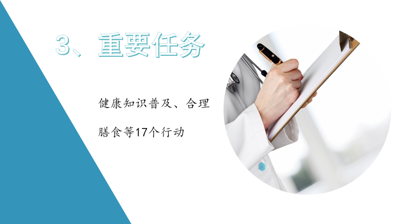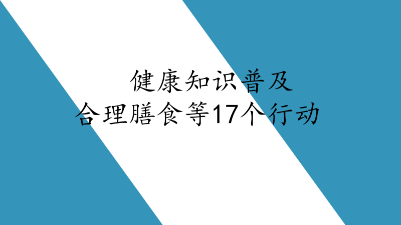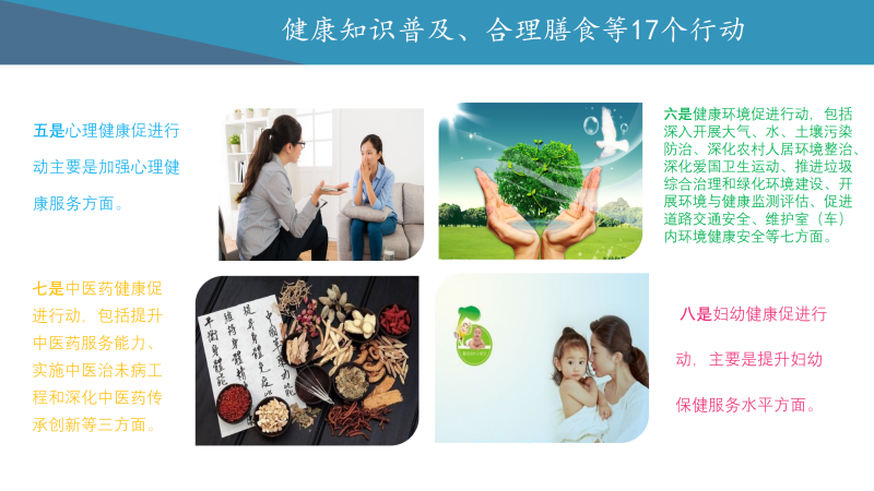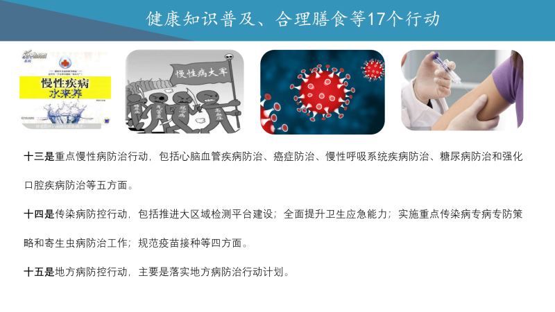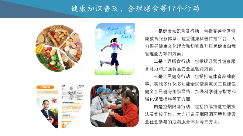 (三)重點任務。包含健康知識普及、合理膳食等17個行動。一是健康知識普及行動,包括完善全區健康教育服務體系、建立健康科普傳播平臺、大力倡導健康文化理念和切實提升居民健康自我管理能力等四方面。二是合理膳食行動,包括提升營養健康服務能力和加強食品安全監管兩方面。三是全民健身行動,包括打造體育品牌賽事、實施多樣化多功能全民健身惠民工程建設、健全全民健身組織網絡、加強科學健身指導和強化保障措施等五方面。四是控煙限酒行動,包括持續推進控煙執法及宣傳工作、大力打造無煙限酒環境和建設全社會參與的戒煙服務體系等三方面。五是心理健康促進行動主要是加強心理健康服務方面。六是健康環境促進行動,包括深入開展大氣、水、土壤污染防治、深化農村人居環境整治、深化愛國衛生運動、推進垃圾綜合治理和綠化環境建設、開展環境與健康監測評估、促進道路交通安全、維護室(車)內環境健康安全等七方面。七是中醫藥健康促進行動,包括提升中醫藥服務能力、實施中醫治未病工程和深化中醫藥傳承創新等三方面。八是婦幼健康促進行動,主要是提升婦幼保健服務水平方面。九是青少年健康促進行動,主要是提升青少年身心健康水平方面。十是職業健康保護行動,包括推進職業病危害源頭治理、加強職業病防治體系建設、深化職業病患者救助救治活動和用人單位落實職業病防治主體責任等四方面。十一是老年健康促進行動,包括建立完善老年健康服務政策、合理配置老年健康服務資源、不斷提升老年健康服務能力和著力建設老年友好型社會等四方面。十二是殘疾預防健康行動,主要是維護殘疾人健康方面。十三是重點慢性病防治行動,包括心腦血管疾病防治、癌癥防治、慢性呼吸系統疾病防治、糖尿病防治和強化口腔疾病防治等五方面。十四是傳染病防控行動,包括推進大區域檢測平臺建設;全面提升衛生應急能力;實施重點傳染病專病專防策略和寄生蟲病防治工作;規范疫苗接種等四方面。十五是地方病防控行動,主要是落實地方病防治行動計劃。十六是健康細胞示范建設行動,包括深化健康細胞示范建設、建設健康機關、建設健康軍營、建設健康社區、建設健康村莊、建設健康學校、建設健康醫院、建設健康企業、建設健康家庭等。十七是健康保障完善行動,包括健康服務體系建設、健康信息化建設和健康人才隊伍建設等三方面。