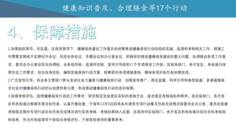 (四)保障措施。包括加強組織領導、廣泛宣傳引導和加強考核評估三方面。