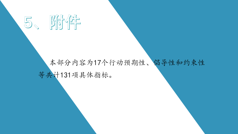 (五)附件部分。具體為17個行動預期性、倡導性和約束性等共計131項具體指標。
