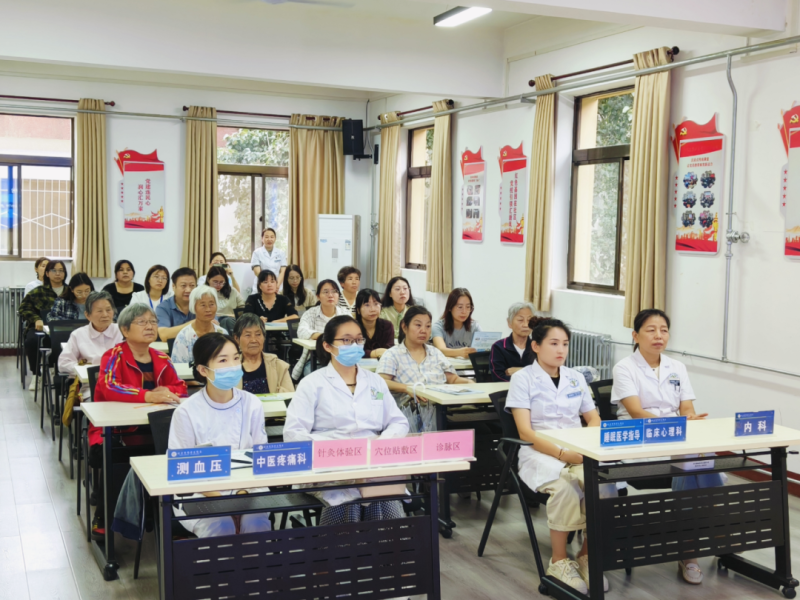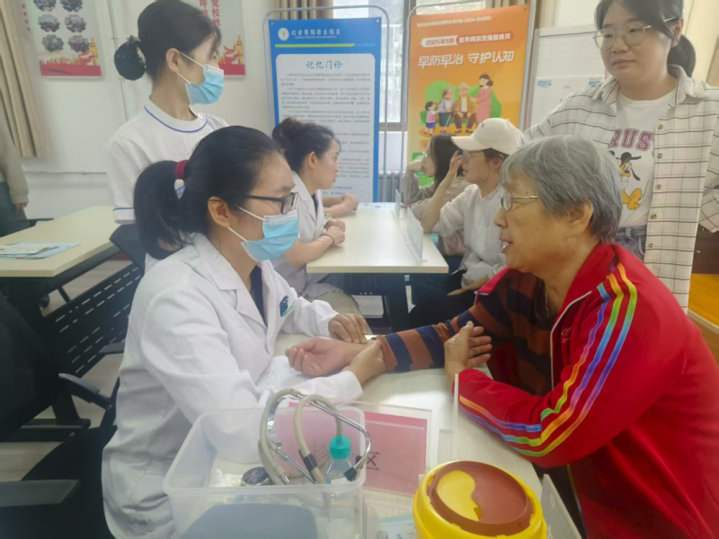 講座結(jié)束后,醫(yī)護人員為居民進行了免費血壓測量、認知量表檢測、認知障礙篩查、照護知識指導(dǎo)、飲食與用藥指導(dǎo)等健康檢測與指導(dǎo),居民免費體驗中醫(yī)把脈、穴位貼敷、針灸等理療項目。