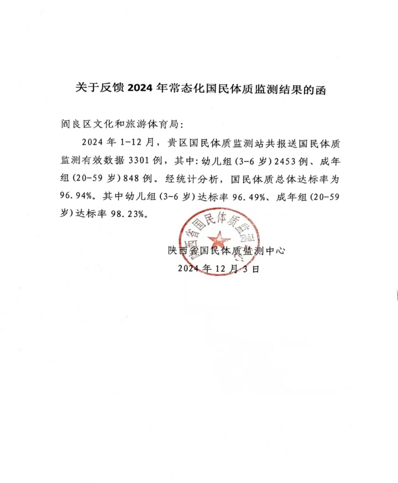 為深入貫徹全民健身國家戰略,全面提升我區居民身體素質和健康水平,科學指導全民健身活動的普及和發展,根據《全民健身條例》及《國民體質監測工作規定》《國民體質測定標準(2023年修訂)》等相關文件精神,閻良區2024年在全區范圍內開展了國民體質監測調查統計工作,依據陜西省國民體質監測中心《關于反饋2024年常態化國民體質監測結果的函》,現將閻良區2024年常態化國民體質監測結果予以公布: