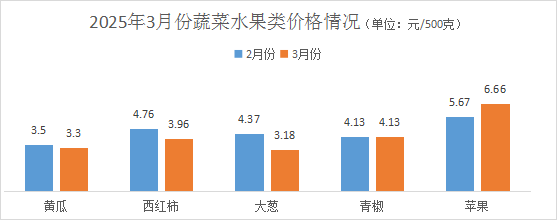 本月,蔬菜類價格漲跌互現,與上月相比:黃瓜價格每500克均價3.3元,環比降幅5.71%;西紅柿價格每500克均價3.96元,環比降幅16.81%;大蔥價格每500克均價3.18元,環比降幅27.23%;青椒價格每500克均價4.13元,環比持平。水果類價格漲幅為主,以蘋果為例,蘋果價格每500克均價6.66元,環比漲幅17.46%。