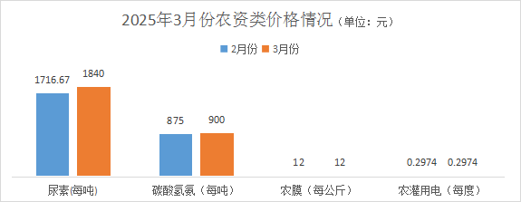 農資類價格略有浮動。其中尿素均價1840元/噸,環比漲幅7.18%;碳酸氫氨均價900元/噸,環比漲幅2.86%;農膜均價12元/公斤(國產幅寬4米),環比持平;農灌用電價格每度0.2974元,環比持平。