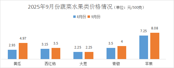 本月,蔬菜類價(jià)格漲幅為主,與上月相比:黃瓜價(jià)格每500克均價(jià)4.97元,環(huán)比漲幅69.62%;西紅柿價(jià)格每500克均價(jià)3.5元,環(huán)比漲幅11.11%;大蔥價(jià)格每500克均價(jià)2.25元,環(huán)比持平;青椒價(jià)格每500克均價(jià)4元,環(huán)比漲幅14.29%。水果類價(jià)格漲跌互現(xiàn),以蘋果為例,蘋果價(jià)格每500克均價(jià)8.08元,環(huán)比漲幅11.45%。