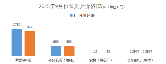 農(nóng)資類價(jià)格略有浮動(dòng)。其中尿素均價(jià)1600元/噸,環(huán)比降幅10.11%;碳酸氫氨均價(jià)650元/噸,環(huán)比持平;農(nóng)膜均價(jià)12元/公斤(國(guó)產(chǎn)幅寬4米),環(huán)比持平;農(nóng)灌用電價(jià)格每度0.2974元,環(huán)比持平。