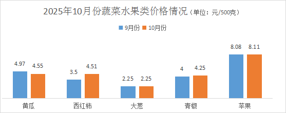 本月,蔬菜類價格漲幅為主,與上月相比:黃瓜價格每500克均價4.55元,環比降幅8.45%;西紅柿價格每500克均價4.51元,環比漲幅28.86%;大蔥價格每500克均價2.25元,環比持平;青椒價格每500克均價4.25元,環比漲幅6.25%。水果類價格漲跌互現,以蘋果為例,蘋果價格每500克均價8.11元,環比漲幅0.37%。