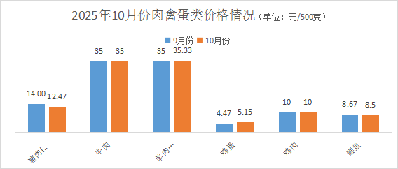 本月,豬肉(去骨后腿肉)價格每500克均價12.47元,環比降幅10.93%;牛肉(去骨后腿肉)價格每500克均價35元,環比持平;羊肉(去骨后腿肉)價格每500克均價35.33元,環比漲幅0.94%;新鮮完整雞蛋價格每500克均價5.15元,環比漲幅15.21%;雞肉價格每500克均價10元,環比持平;鯉魚價格每500克均價8.5元,環比降幅1.96%。