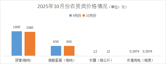 農資類價格略有浮動。其中尿素均價1560元/噸,環比降幅2.5%;碳酸氫氨均價650元/噸,環比持平;農膜均價12元/公斤(國產幅寬4米),環比持平;農灌用電價格每度0.2974元,環比持平。
