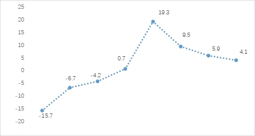 圖4 2020年以來區(qū)屬社會(huì)消費(fèi)品零售總額增速(%)