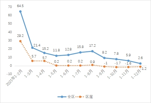圖2 2021年全區(qū)及區(qū)屬規(guī)上工業(yè)增加值月度增速(%)