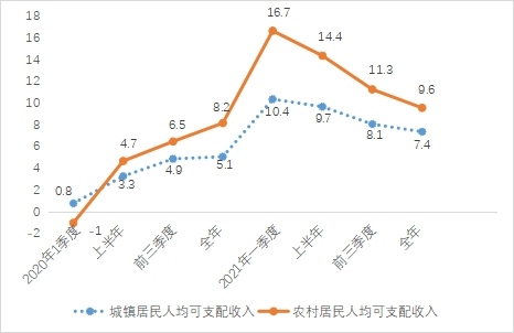 圖5 2020年以來城、鄉(xiāng)居民人均可支配收入增速(%)