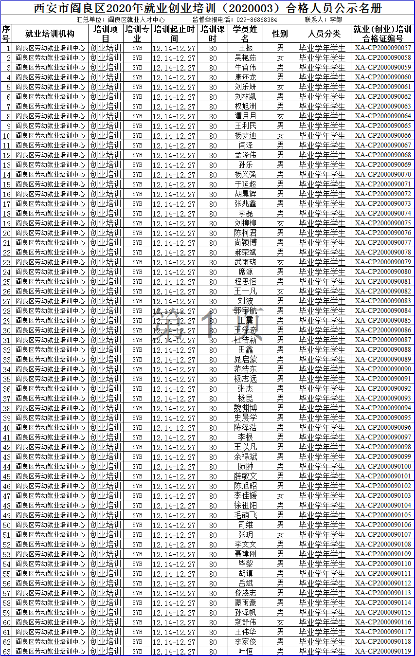 西安市閻良區2020年就業創業培訓(2020003)合格人員公示名冊