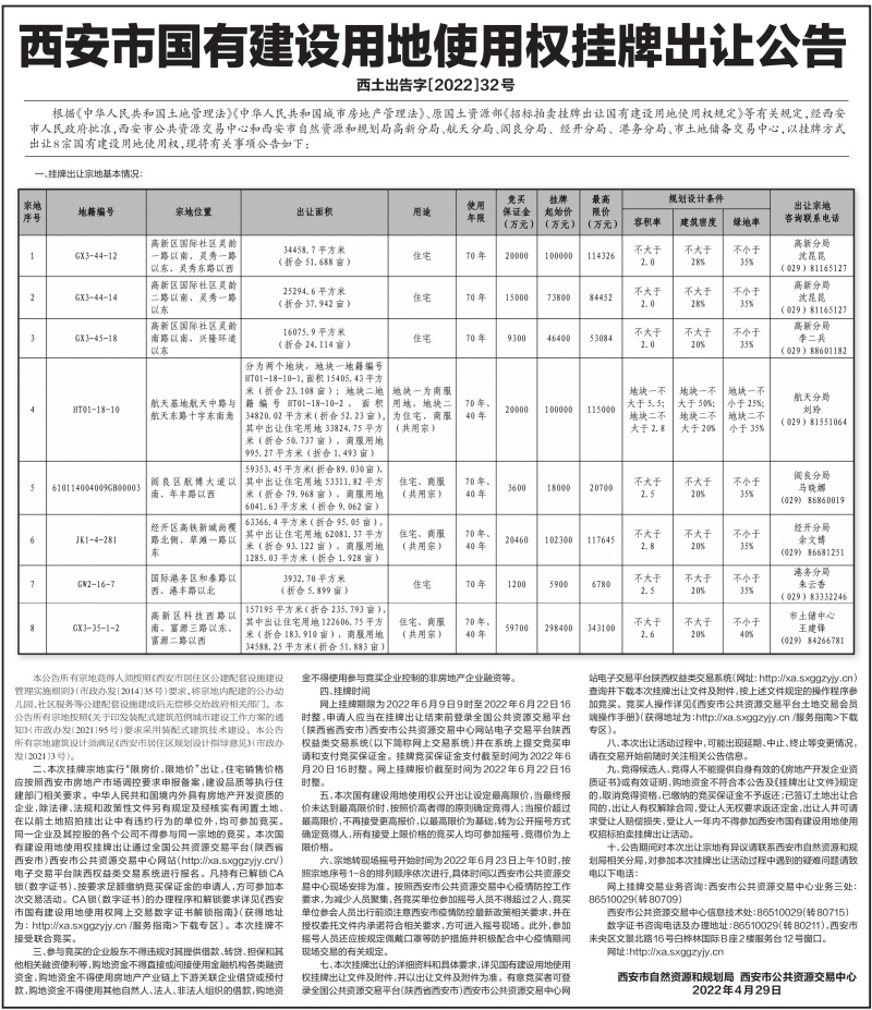 西安市國有建設用地使用權網上掛牌出讓公告(西土出告字〔2022〕32號)