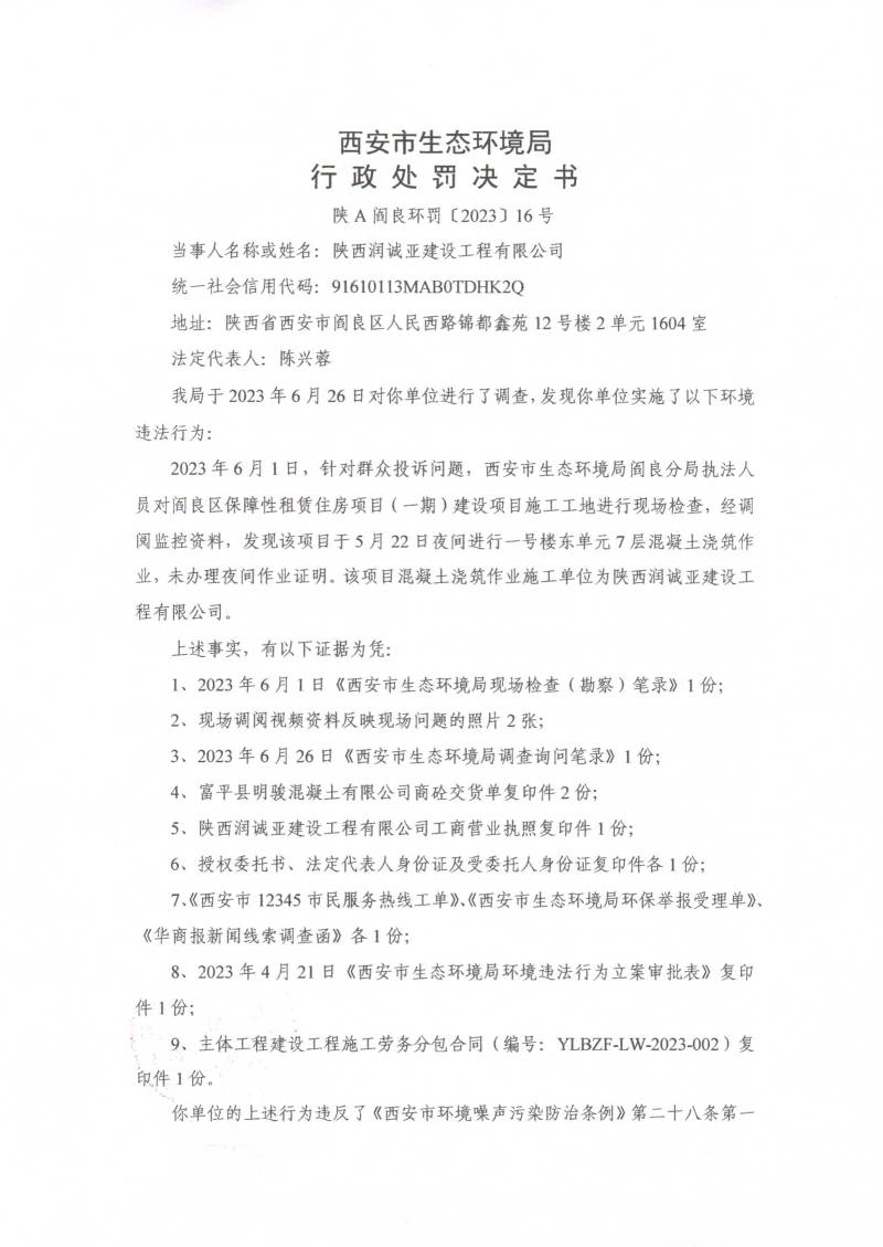 2023年西安市生態(tài)環(huán)境局閻良分局針對陜西潤誠亞建設(shè)工程有限公司環(huán)境違法行為行政處罰信息公開