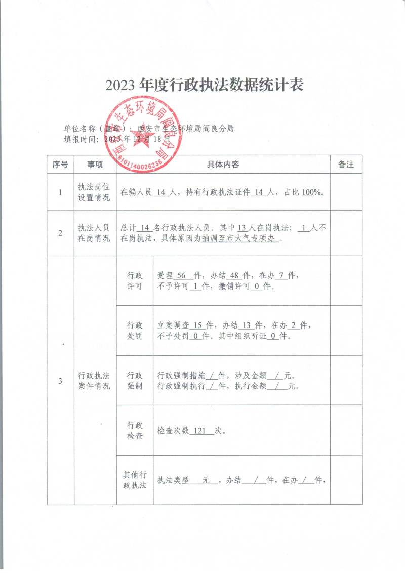 西安市生態環境局閻良分局2023年度行政執法數據統計表信息公開