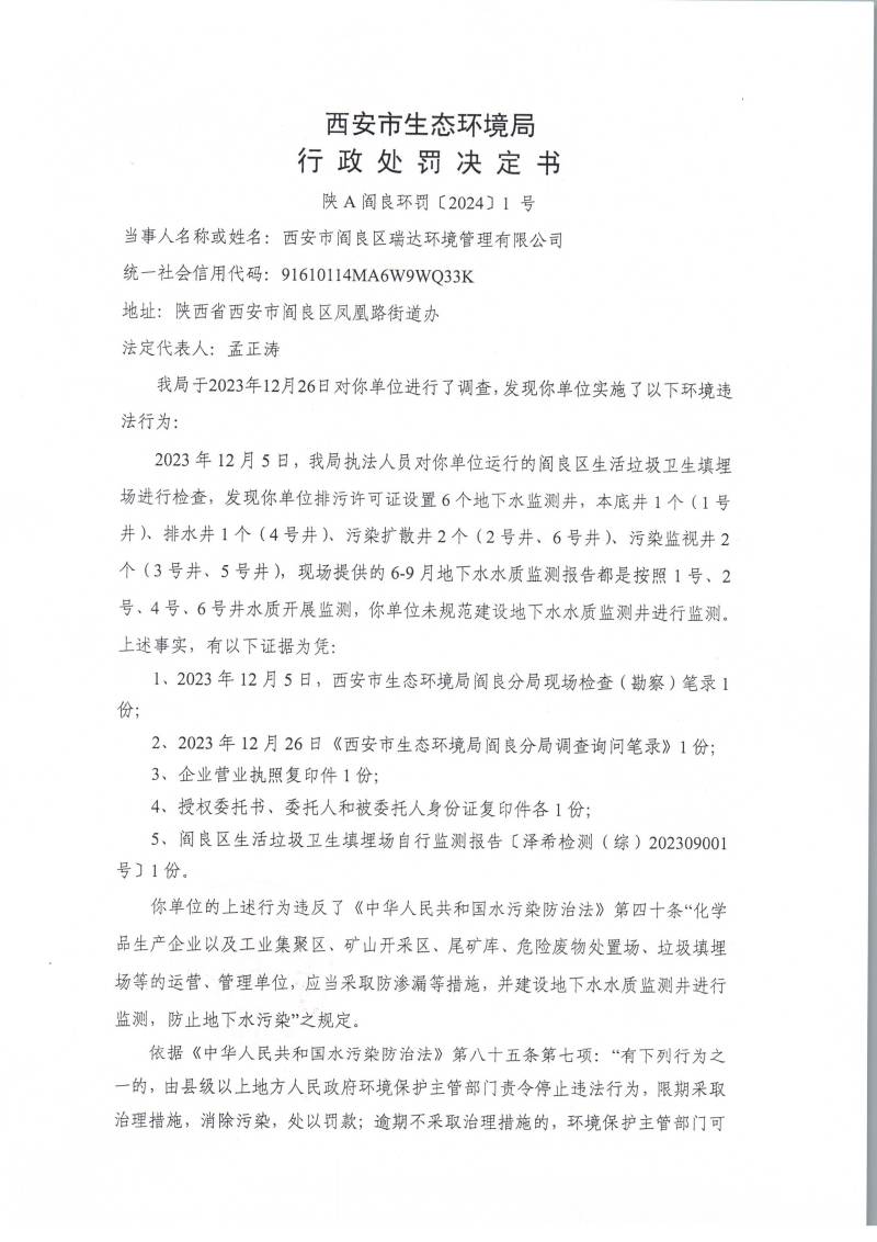 2024年西安市生態(tài)環(huán)境局閻良分局針對(duì)西安市閻良區(qū)瑞達(dá)環(huán)境管理有限公司環(huán)境違法行為行政處罰信息公開