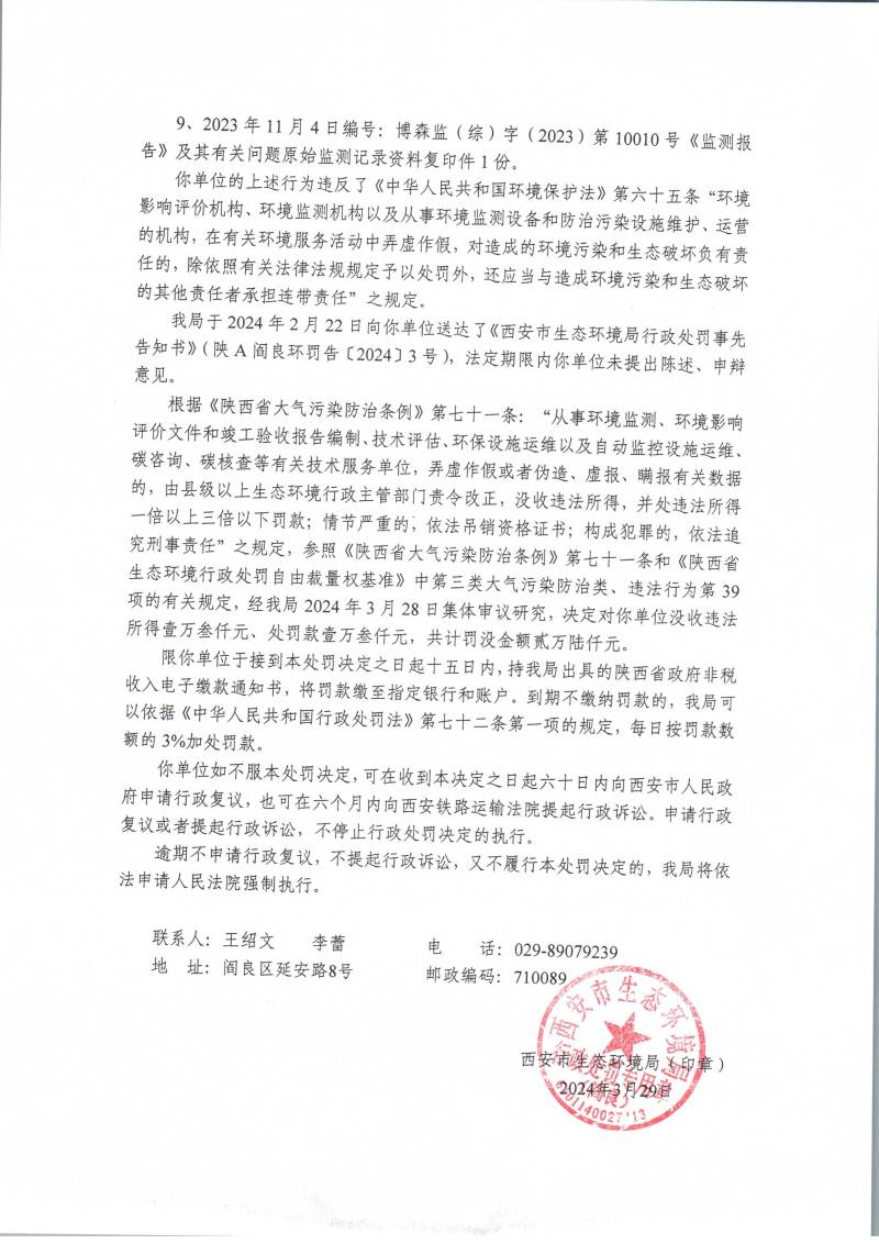 2024年西安市生態環境局閻良分局對陜西博森檢測技術有限公司環境違法行為行政處罰信息公開