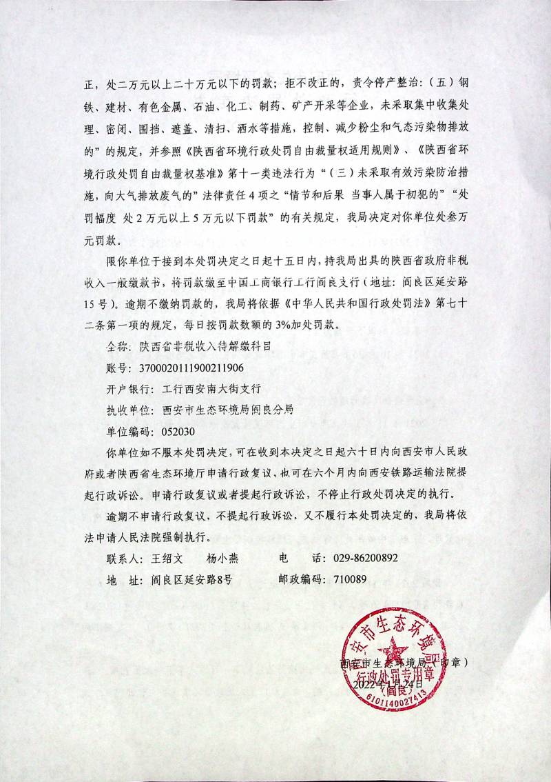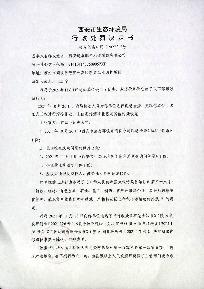 2022年西安市生態環境局閻良分局針對西安建卓航空機械制造有限公司環境違法行為行政處罰信息公開