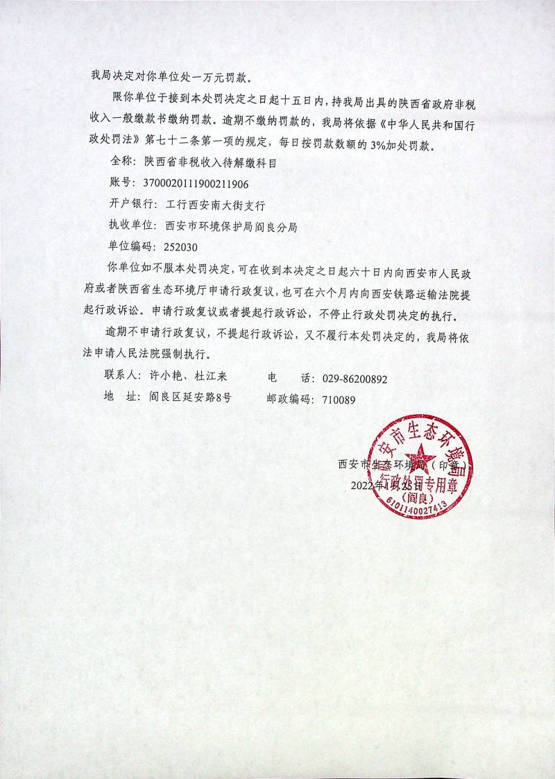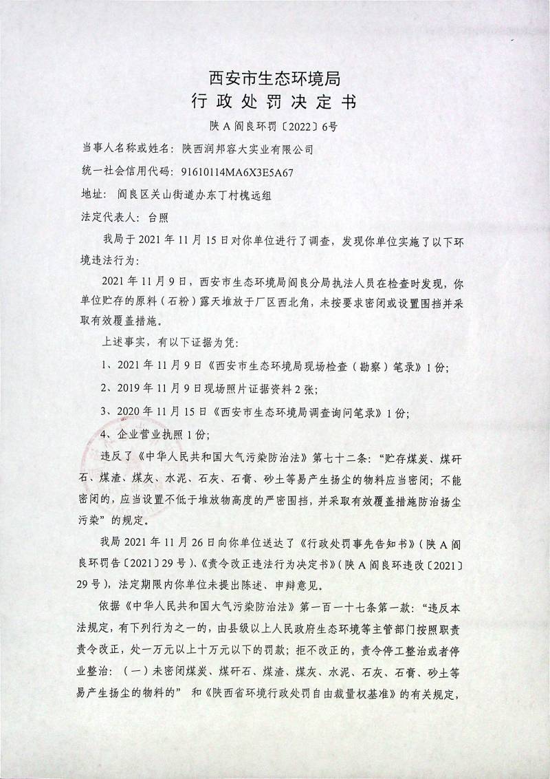 2022年西安市生態環境局閻良分局針對陜西潤邦容大實業有限公司環境違法行為行政處罰信息公開