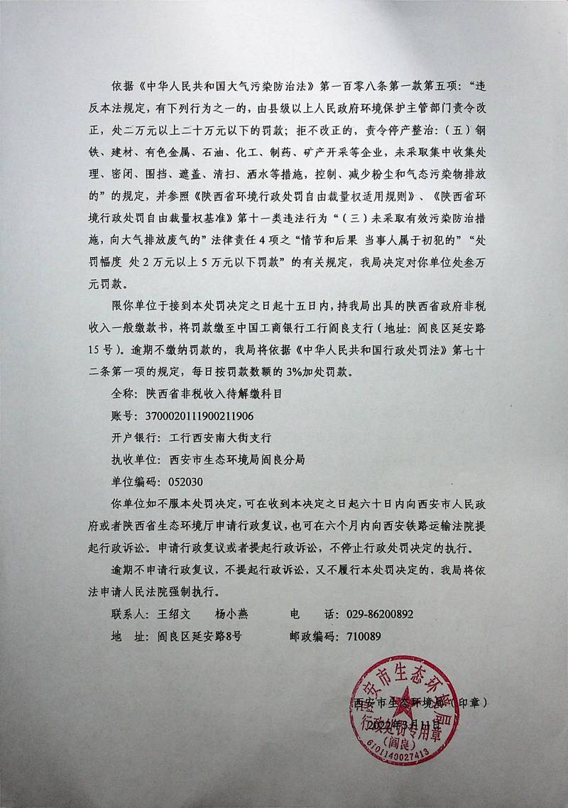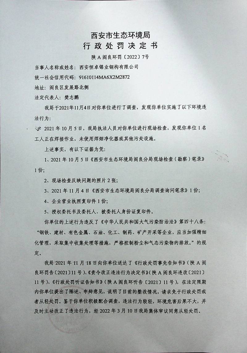 2022年西安市生態環境局閻良分局針對西安恒卓錦業鋼構有限公司環境違法行為行政處罰信息公開