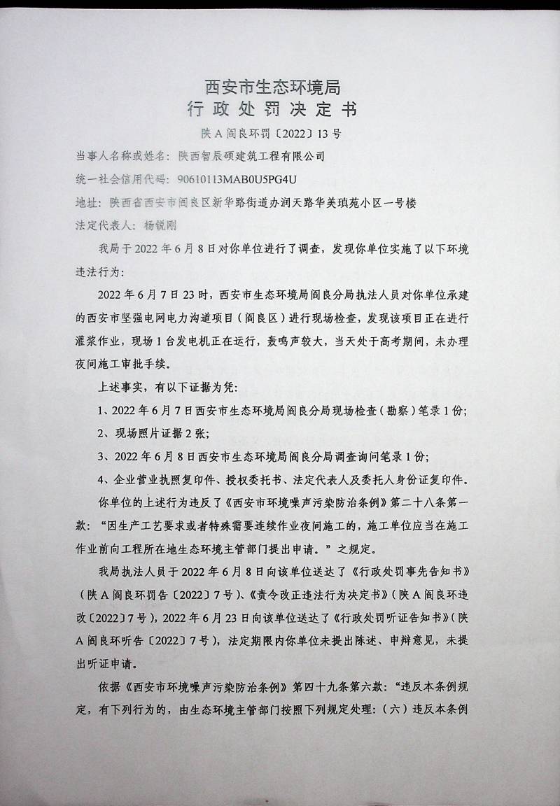 2022年西安市生態(tài)環(huán)境局閻良分局針對陜西智辰碩建筑工程有限公司環(huán)境違法行為行政處罰信息公開