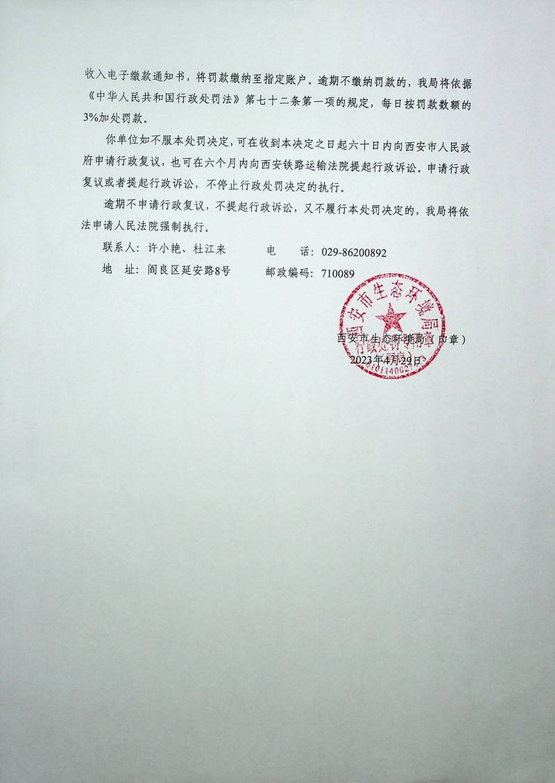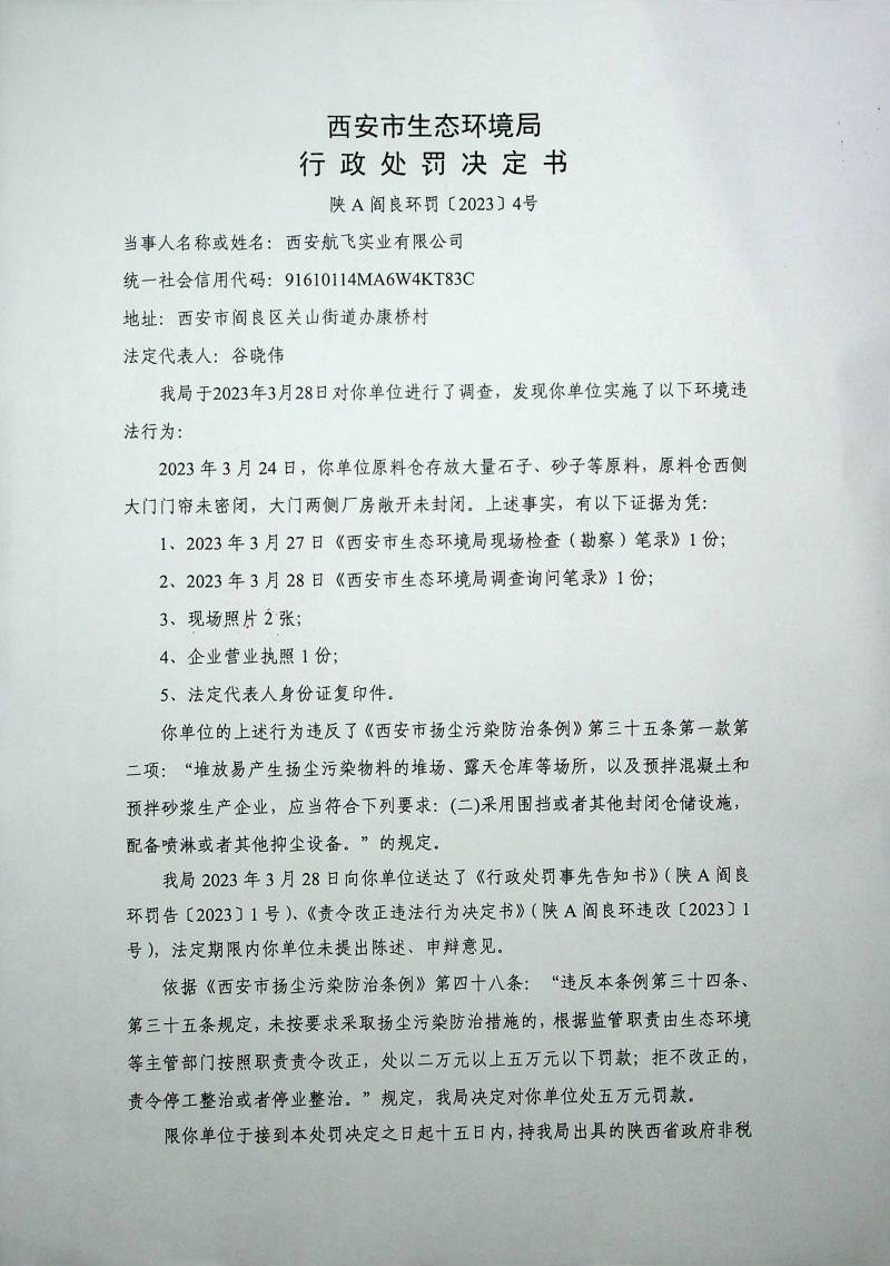 2023年西安市生態環境局閻良分局針對西安航飛實業有限公司環境違法行為行政處罰信息公開