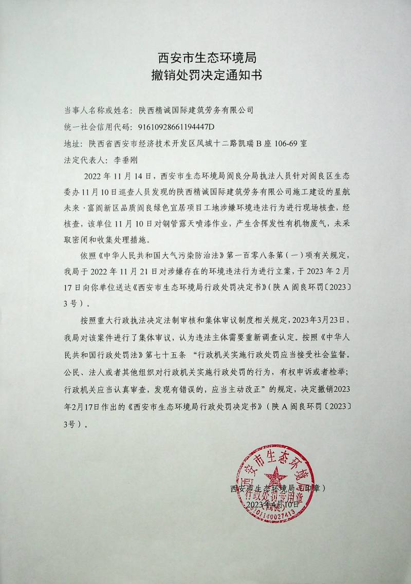 2023年西安市生態環境局閻良分局針對陜西精誠國際建筑勞務有限公司撤銷處罰決定信息公開
