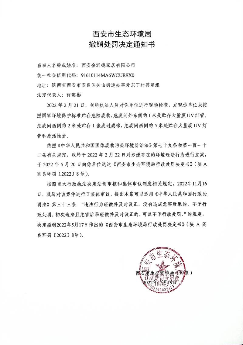 2022年西安市生態環境局閻良分局針對西安金潤德家居有限公司撤銷處罰決定信息公開