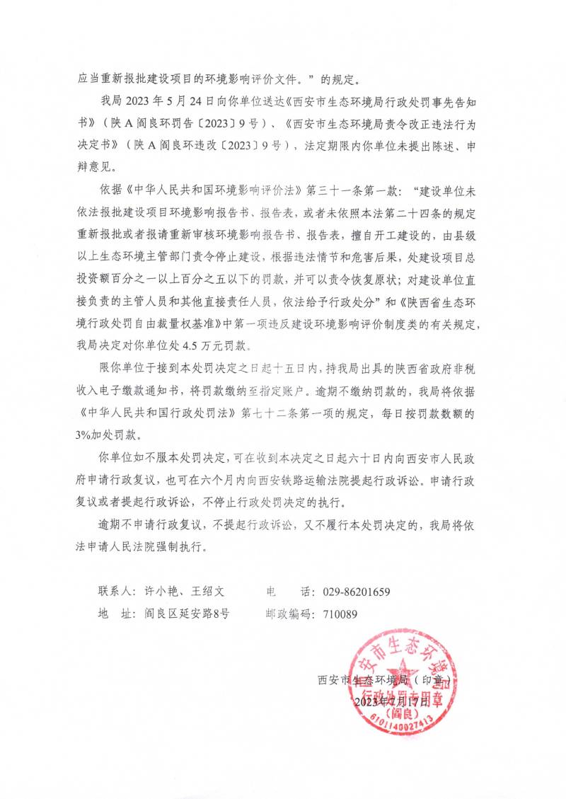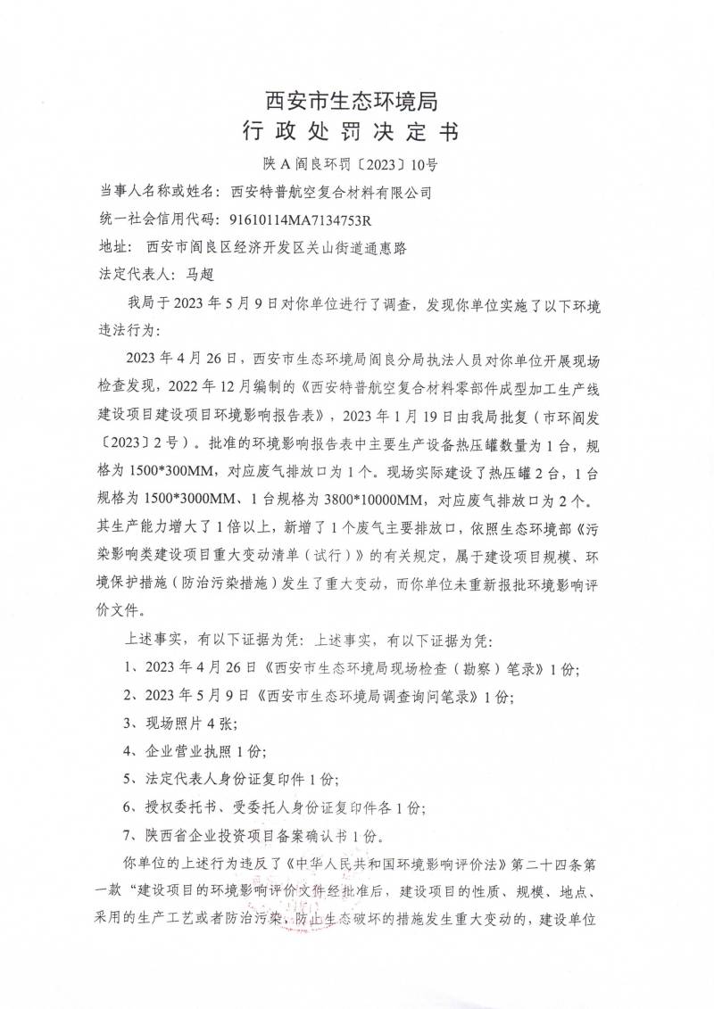2023年西安市生態(tài)環(huán)境局閻良分局針對西安特普航空復合材料有限公司環(huán)境違法行為行政處罰信息公開