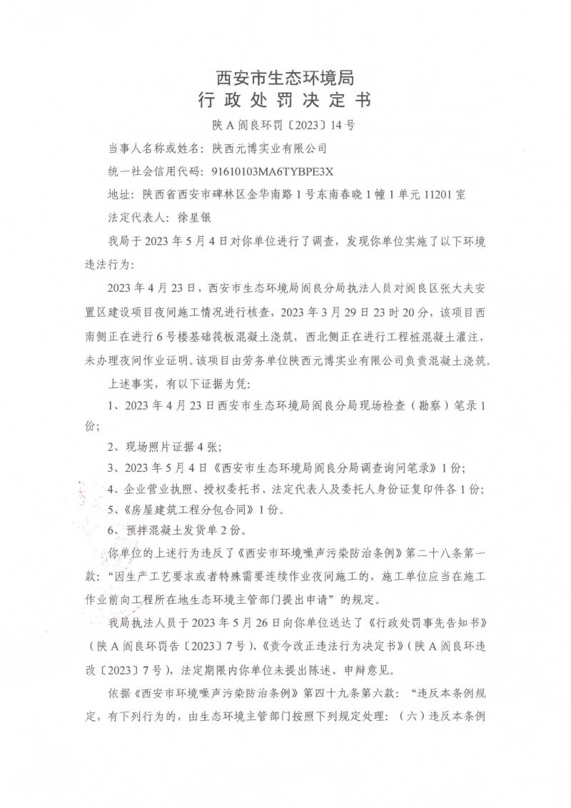 2023年西安市生態環境局閻良分局針對陜西元博實業有限公司環境違法行為行政處罰信息公開