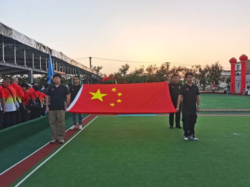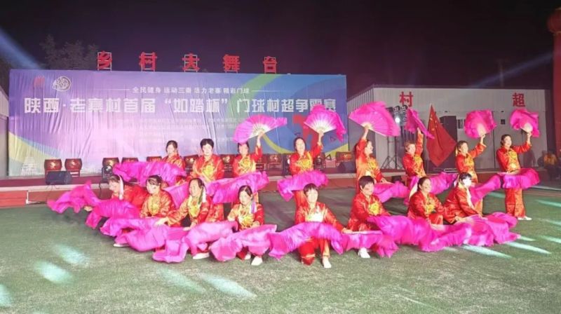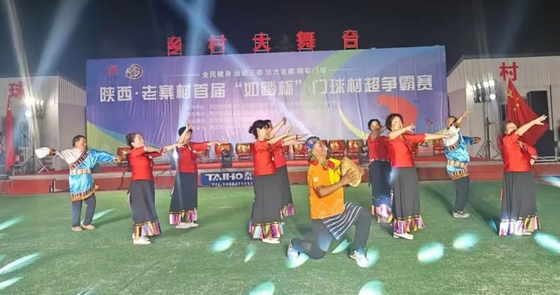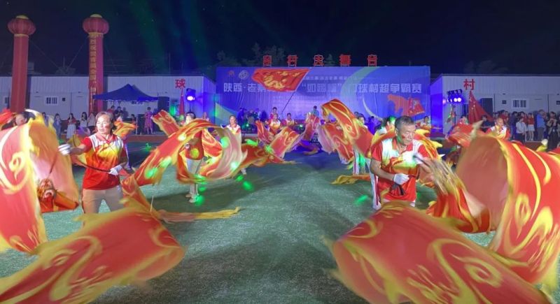 隨著振奮人心的音樂響起,國旗護衛隊莊嚴入場,裁判員、運動員方隊緊跟其后、步履鏗鏘,全場肅立,奏唱國歌后,村超賽前文藝匯演便拉開帷幕。全場深情唱響《我和我的祖國》,整齊嘹亮的歌聲和熱鬧歡騰的《龍騰盛世》舞龍表演將現場氣氛點燃!秦腔經典曲目《梁秋燕》、老寨鼓舞《紅紅火火總是年》、鍋莊舞《舞動的民族風情》等一個個精彩節目依次登場,全場盡情暢享鄉村文化藝術的狂歡!