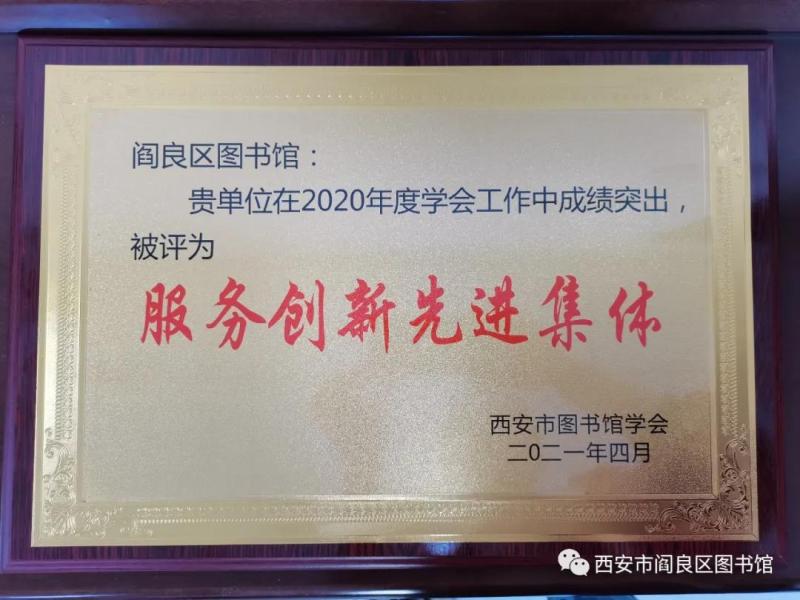 2021年4月8日,西安市圖書(shū)館學(xué)會(huì)第三屆二次理事會(huì)議在高陵召開(kāi),本次會(huì)議就西安市圖書(shū)館2020年度學(xué)會(huì)專項(xiàng)工作先進(jìn)集體進(jìn)行表彰,閻良區(qū)圖書(shū)館被評(píng)為“服務(wù)創(chuàng)新先進(jìn)集體”。