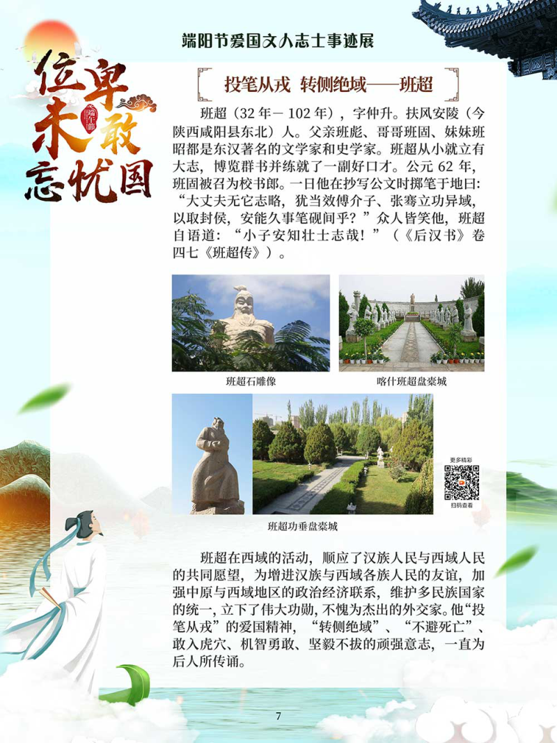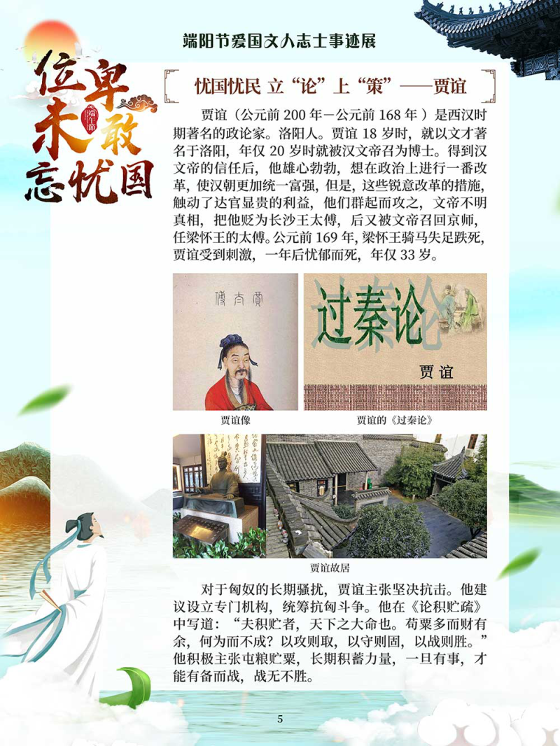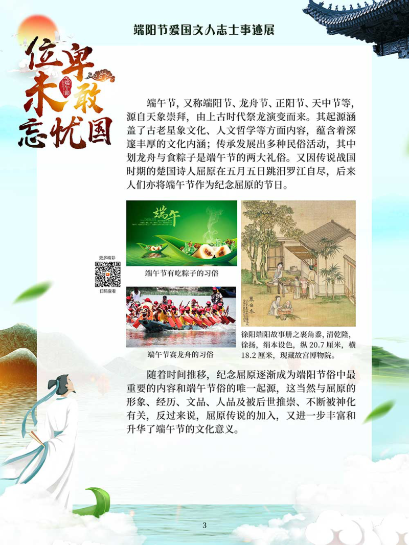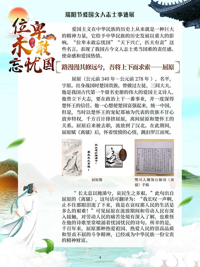 值此端陽節來臨之際,我們特別策劃了“位卑未敢忘憂國——端陽節愛國文人志士事跡展”,以此歌頌那些能把國家民族利益擺在首位,為祖國的前途、命運分愁擔憂,為天底下的人民謀幸福的文人志士的政治抱負和博大胸襟。
