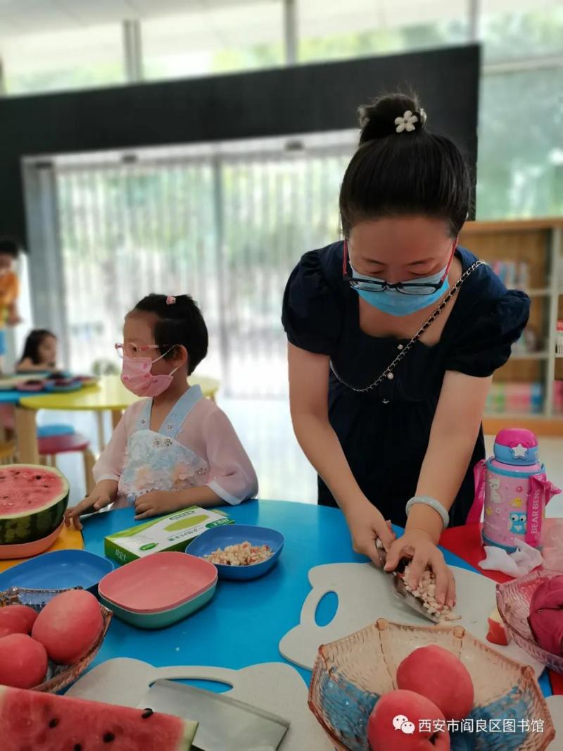 本次活動發布后,廣大讀者熱情參與,共有20組家庭40人參加。本次活動由西安市非物質文化遺產保護協會會員、區級非遺項目傳承人褚玲云擔任輔導老師。活動開始前,褚老師首先向各位家長和小朋友們介紹所用的食材:晶瑩剔透的冰粉,清甜多汁的西瓜,香噴噴的花生碎,酸甜可口的藍莓、蘋果等。接著老師又示范了冰粉制作的過程,如何拿取食材,根據每各人口味如何搭配食材。孩子們一下子來了興趣,各個摩拳擦掌,不等老師說完就準備動手。